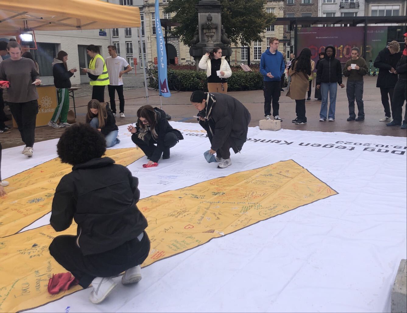 Op de Dag tegen Kanker tonen onze leerlingen van 5 doorstroom finaliteit een warm gebaar van solidariteit tijdens hun lessen burgerschap. Op de veemarkt lag een reuzengroot geel lint. Hier schreven de jongeren bemoedigende woorden die niet alleen een bron van troost waren voor degenen die momenteel tegen kanker vechten, maar ook dienden als een krachtig middel om bewustzijn te verspreiden. Het geel lint is een symbool van hoop en optimisme. Onze leerlingen hopen dat ze met hun warme boodschappen een positieve impact maken in de strijd tegen deze ingrijpende ziekte.